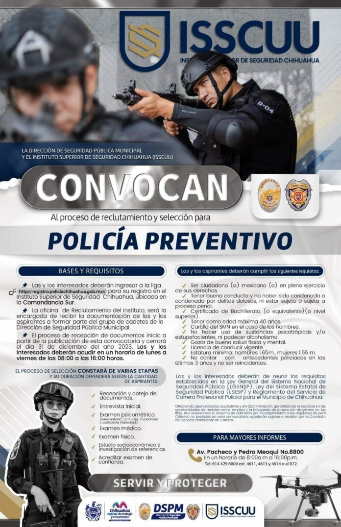 La dirección de seguridad pública municipal (DSPM) y el instituto superior de seguridad Chihuahua (ISSCUU) abren convocatoria para el proceso de reclutamiento y selección de Policía Preventivo y Bombero de Academia