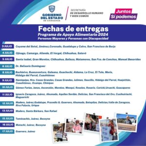 El 3 de julio, la distribución de despensas se realizará en los municipios de Coyame del Sotol, Jiménez, Coronado, Guadalupe y Calvo y San Francisco de Borja; mientras que el jueves 4 se llevará a cabo en Ojinaga, Camargo, Allende, El Vergel, Chihuahua y Satevó.
