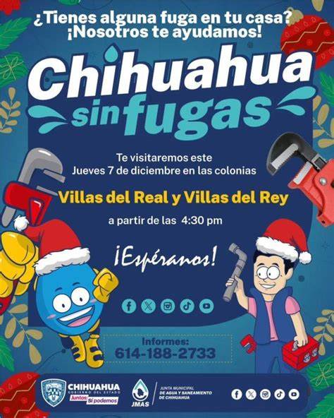 CHIHUAHUA.- La Junta Municipal de Agua y Saneamiento (JMAS) ofrecerá servicios del programa “Chihuahua Sin Fugas” el día de hoy jueves 7 de diciembre a las 16:30hrs en las colonias Villas del Rey y Villas del Real.