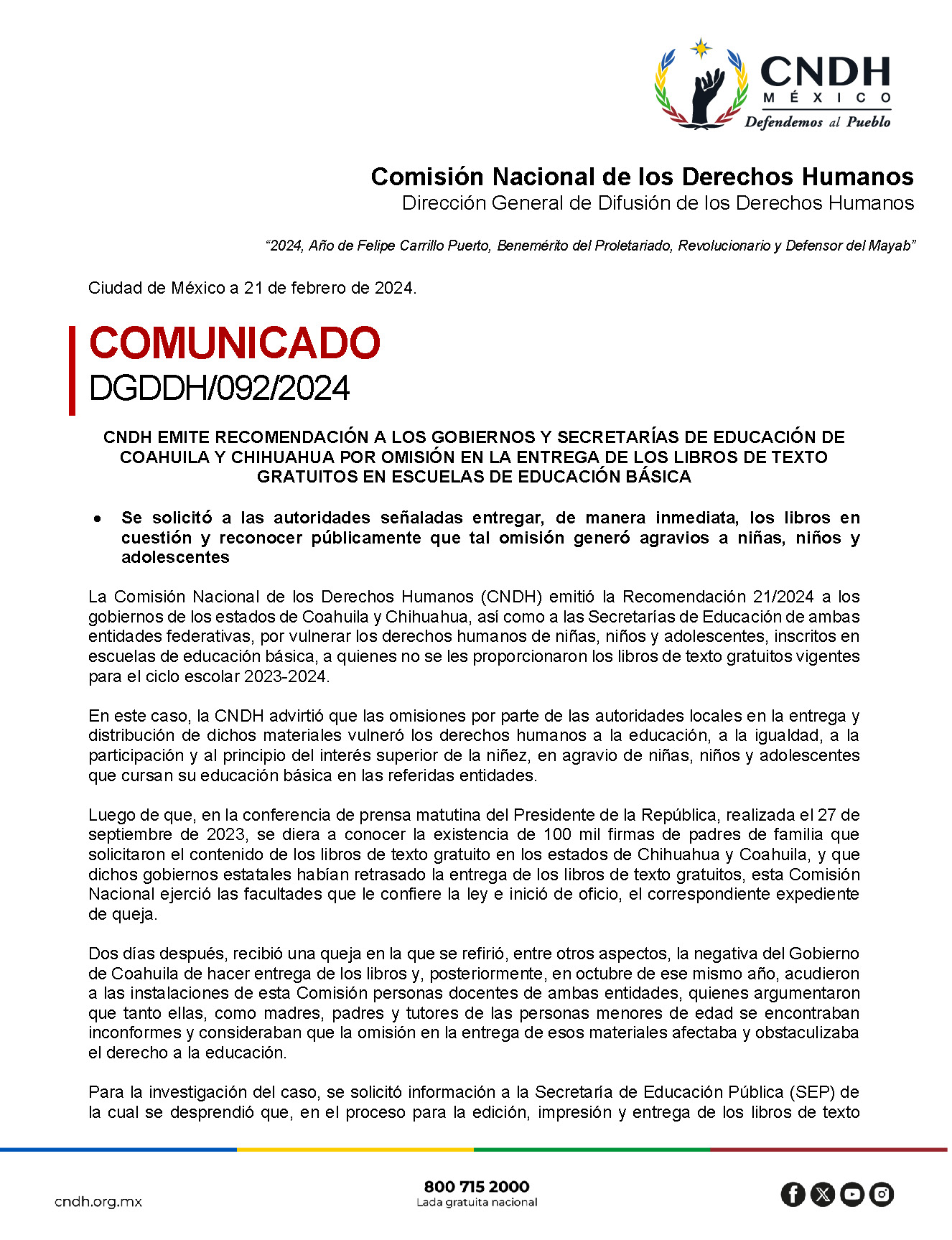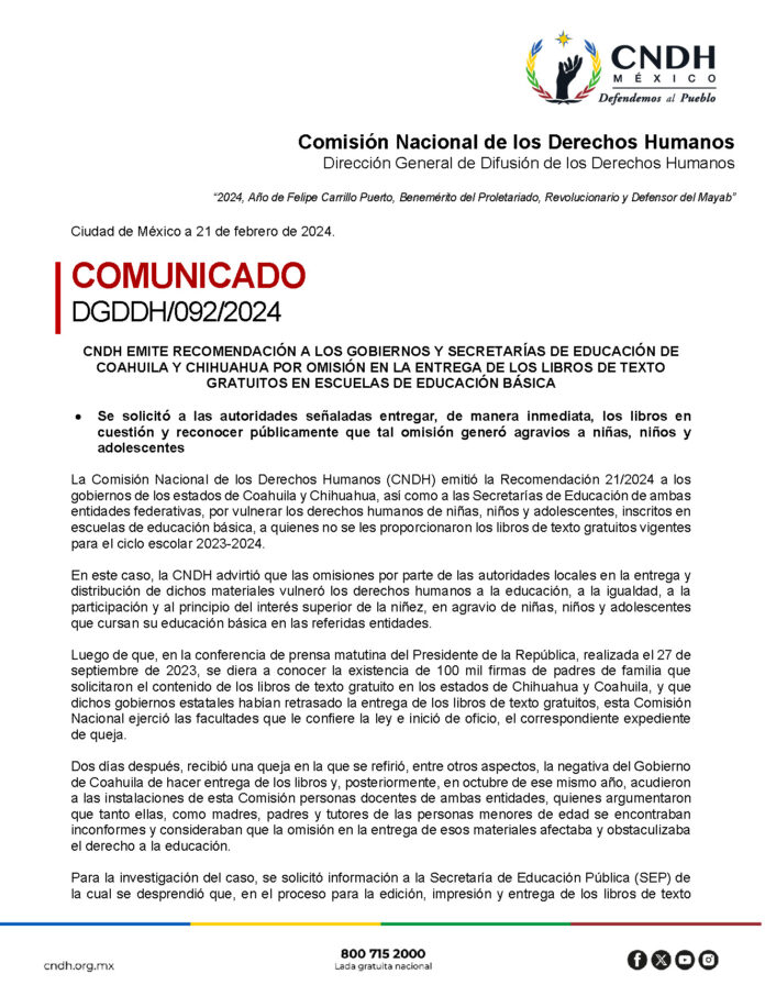 Principal CNDH hace recomendaciones a gobiernos por omitirse en la entrega de libros Por Admin - 22 de febrero de 2024 0 4 WhatsApp