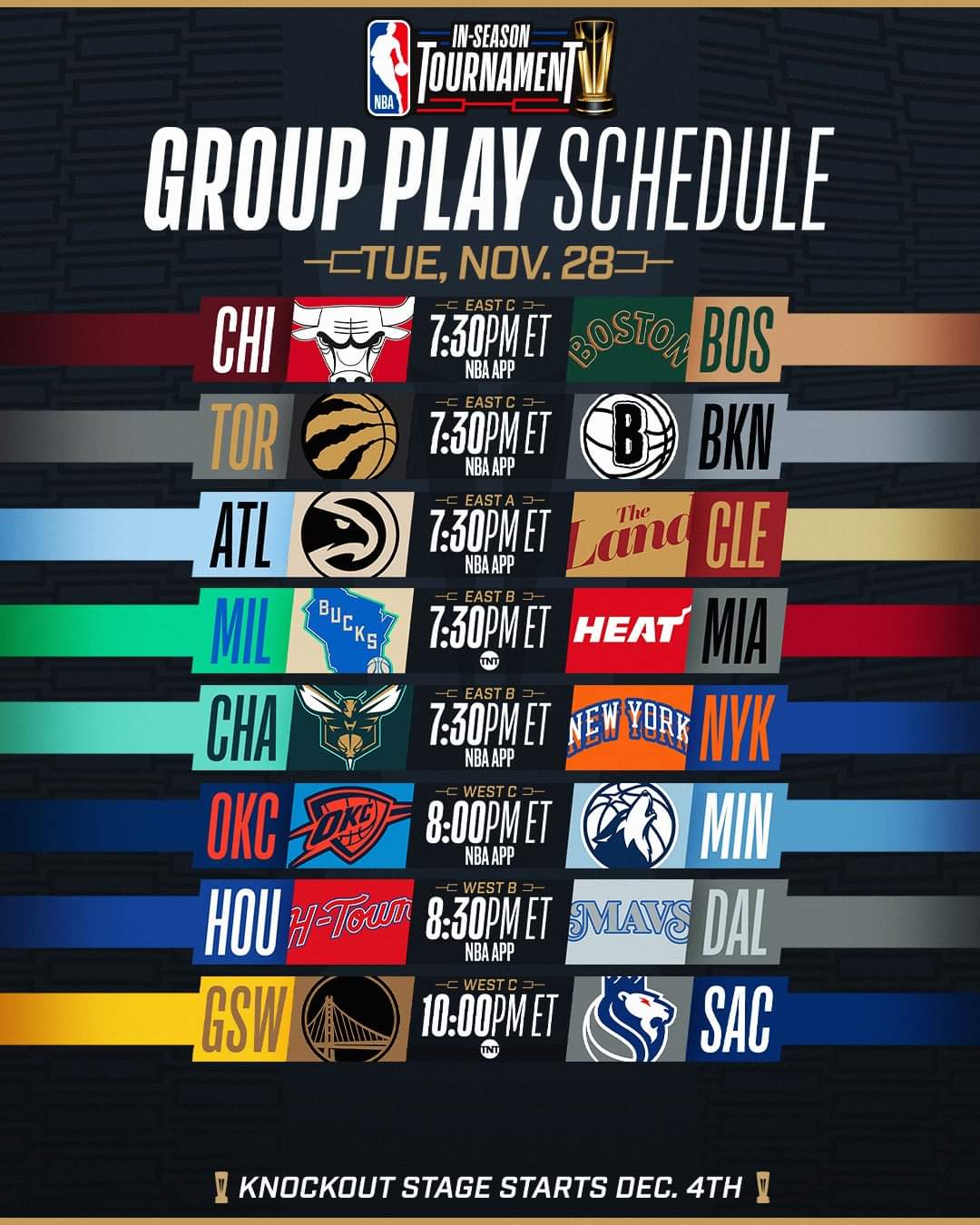 El In-Season Tournament esta cerca de su siguiente fase y solo 2 equipos han clasificado para esta misma, así que la NBA hizo un anuncio de que los partidos del día de hoy son para que los equipos participantes tengan la oportunidad de entrar a la siguiente fase del torneo aún así ya estén eliminados algunos.