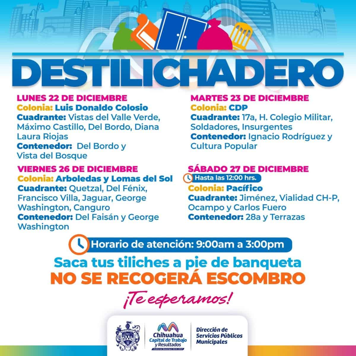El programa municipal de Destilichadero estará presente en cinco colonias de la ciudad entre el 22 y el 27 de diciembre. La iniciativa busca facilitar a los vecinos la disposición de objetos en desuso y evitar que terminen en la vía pública o en lotes baldíos. Las autoridades informaron que se colocarán contenedores en puntos estratégicos de cada colonia, con horarios definidos para que los ciudadanos puedan acudir a depositar muebles, aparatos y otros artículos que ya no utilicen. El objetivo es mantener las calles limpias y prevenir focos de contaminación, además de fomentar la cultura de orden y responsabilidad en el manejo de residuos.