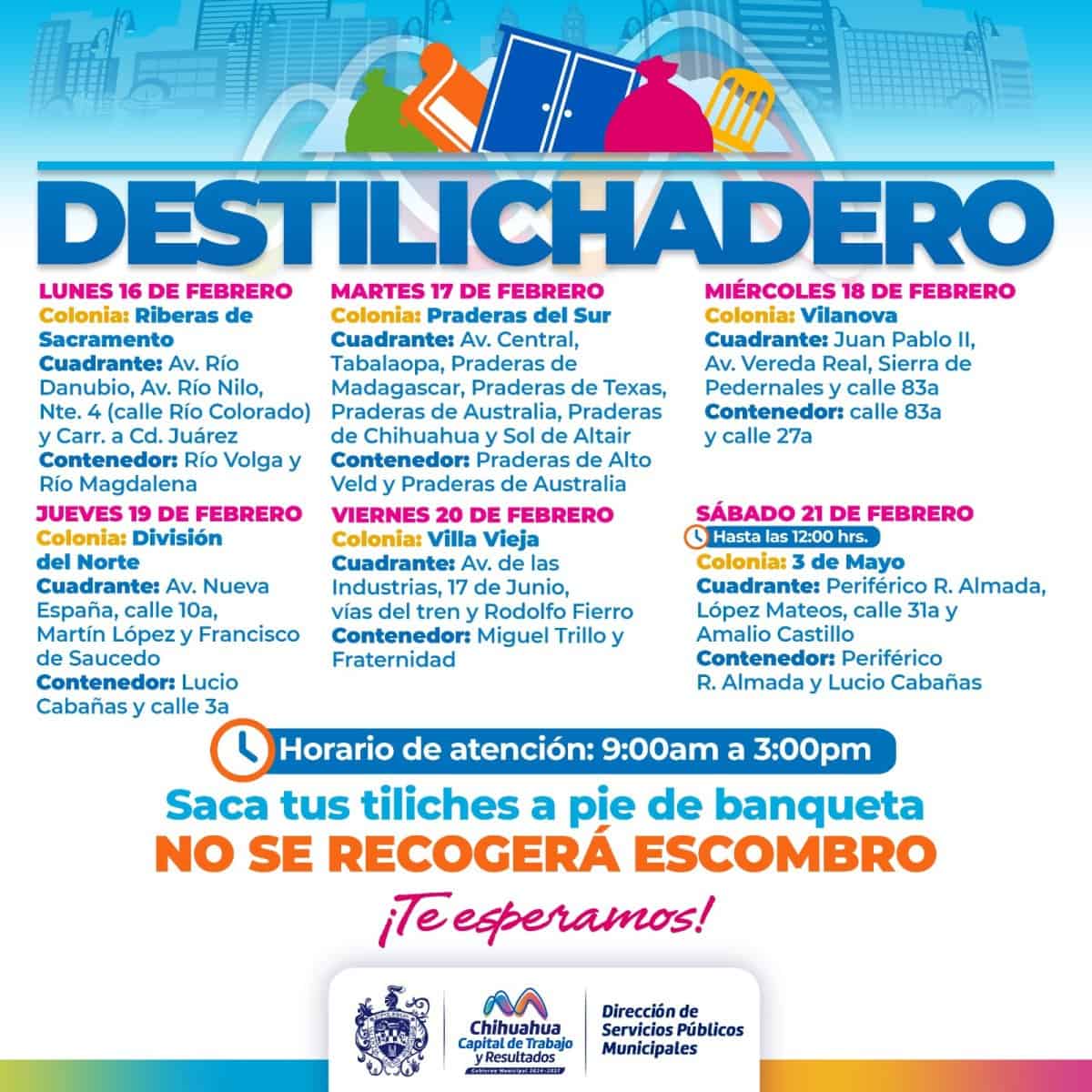 El programa Destilichadero se llevará a cabo del 16 al 21 de febrero en seis colonias de la capital. La iniciativa busca retirar basura de grandes dimensiones que no puede ser trasladada por los camiones recolectores, evitando acumulaciones que generen plagas o problemas de salud.