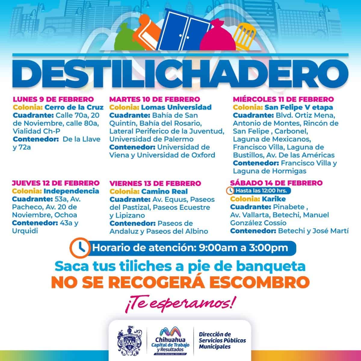 El Gobierno Municipal anunció el calendario del programa Destilichadero, que se llevará a cabo del 9 al 14 de febrero en seis colonias de Chihuahua. La iniciativa busca retirar objetos de gran tamaño que no pueden ser transportados por los camiones recolectores tradicionales.