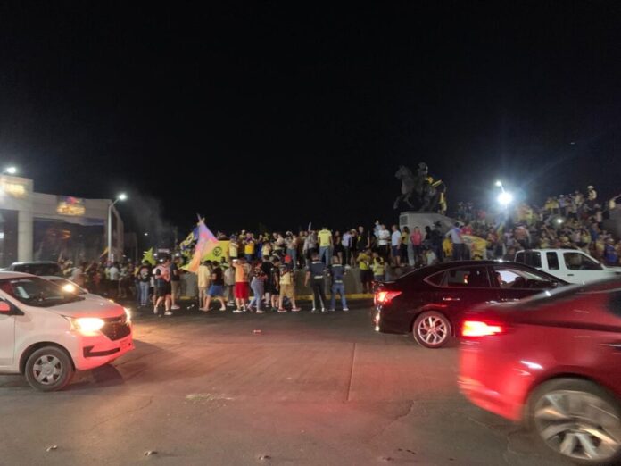 Los aficionados del Club América acudieron con playeras alusivas al equipo y banderas para expresar su alegría ante el triunfo de su equipo. Los cánticos, el sonido de las cornetas y el ondear de las banderas pintaron de azulcrema la emblemática glorieta, donde los hinchas se congregaron para festejar el campeonato.