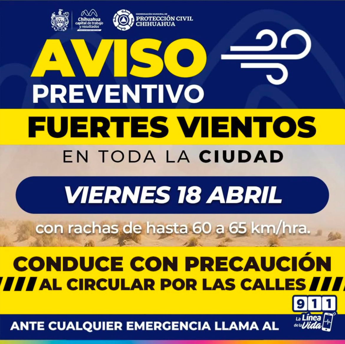 La Coordinación de Protección Civil del Municipio emitió una alerta preventiva para este Viernes Santo, debido a la presencia de fuertes rachas de viento que se estiman entre los 60 y 65 kilómetros por hora en la ciudad de Chihuahua.