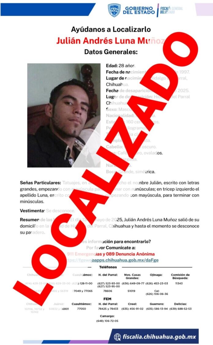 En otro caso, agentes localizaron en la ciudad de Chihuahua a Julián Andrés L.M., de 28 años de edad, quien había sido reportado como desaparecido desde el pasado 13 de mayo. El joven explicó ante el Ministerio Público que se internó voluntariamente en un centro de rehabilitación sin notificar a sus familiares.