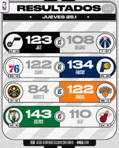 Muchos equipos liderando actualmente su conferencia este el caso de Boston Celtics que consiguió la victoria ante Miami Heat por 33 puntos de diferencia, además de que Knicks sorprendió a los fans ganándole al actual campeón de la NBA Denver Nuggets 84-122, espectacular lo de el día de ayer.