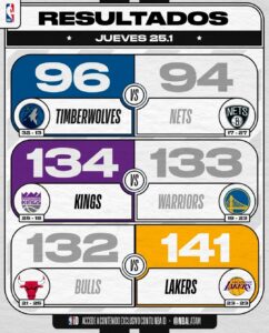 La National Basketball Association (NBA) el día de ayer jueves llevo partidos a cabo de su temporada regular, y estos fueron los resultados.