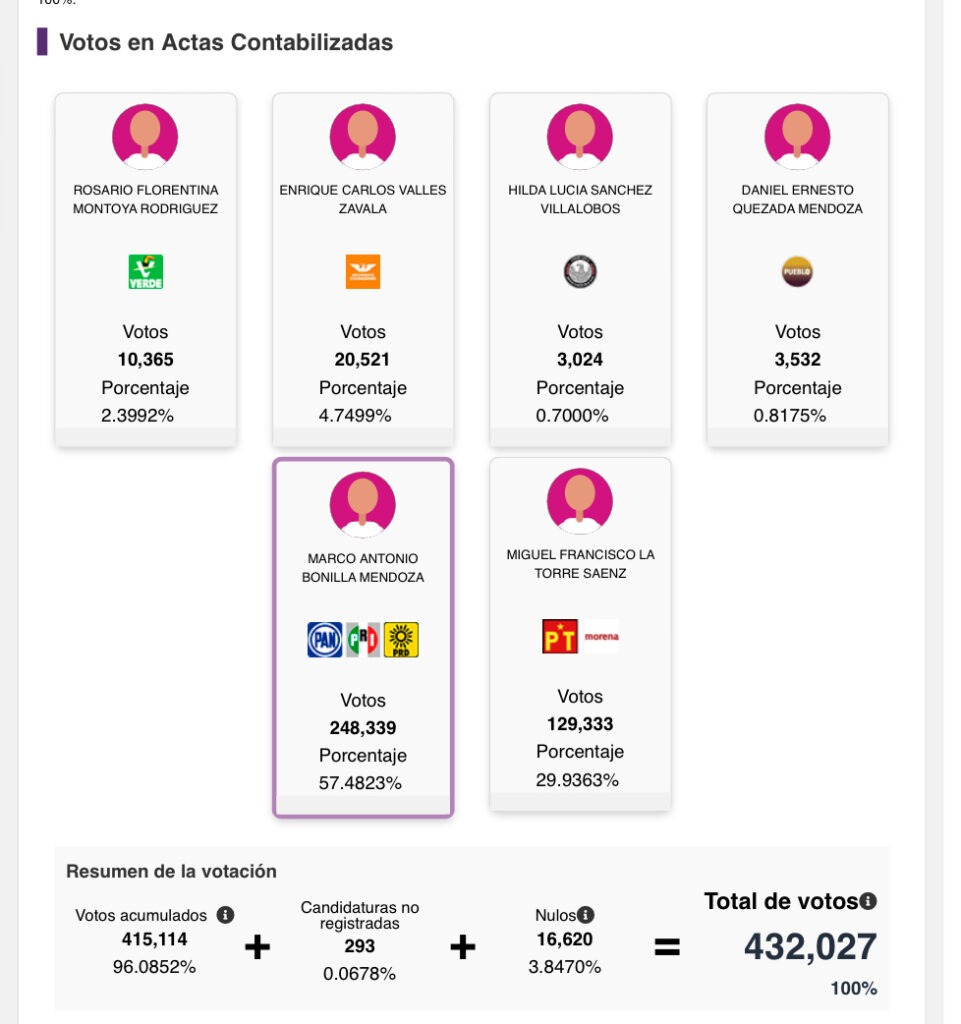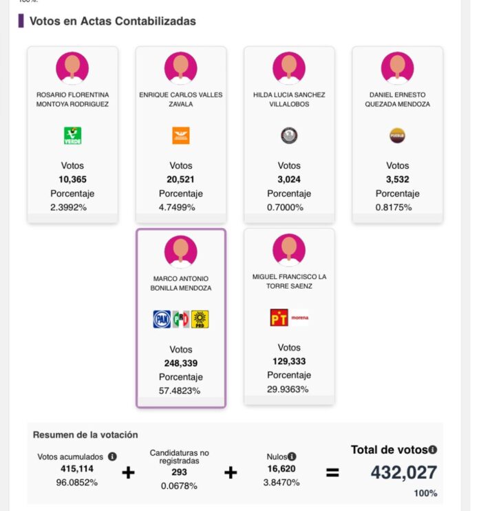 Marco Bonilla, quien había solicitado licencia como alcalde de Chihuahua para buscar su reelección, ganó la reciente contienda por la Presidencia Municipal de Chihuahua con un total de 248,339 votos, equivalentes al 57.48 por ciento de los sufragios emitidos.