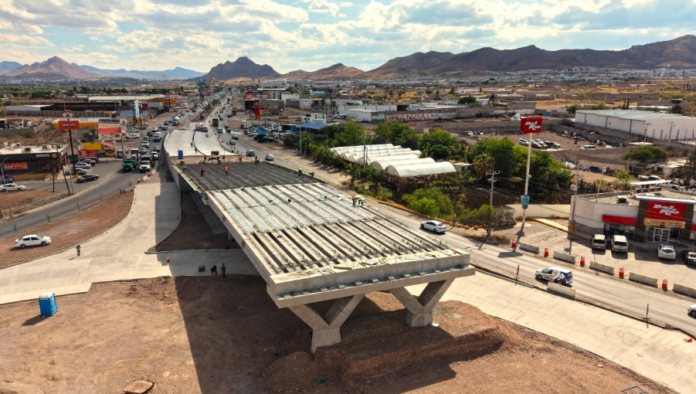 El Gobierno Municipal de Chihuahua continúa con el avance del Paso Superior en la carretera Chihuahua‑Aldama y la avenida Fuerza Aérea, obra que ya supera el 50 por ciento de progreso. Actualmente se trabaja en la pavimentación con concreto hidráulico en las rampas de acceso, así como en el cimbrado y colado de diafragmas en los tramos donde ya fueron colocadas las trabes de concreto reforzado.