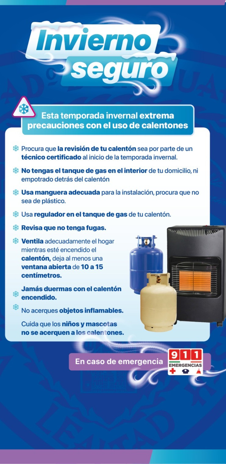 La Coordinación Estatal de Protección Civil (CEPC) exhorta a la población a tomar precauciones en el uso de calentones, ante la llegada inminente de la segunda tormenta invernal que afectará al estado en las próximas horas.