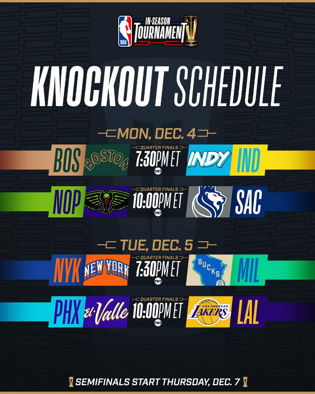 La National Basketball Association (NBA) el día de ayer llevó a cabo los juegos para clasificar en la ronda «Knockout» del In-Season Tournament de los cuales ya se decidieron y los juegos de la primera ronda serán el 4 de Diciembre y el 5 de Diciembre.