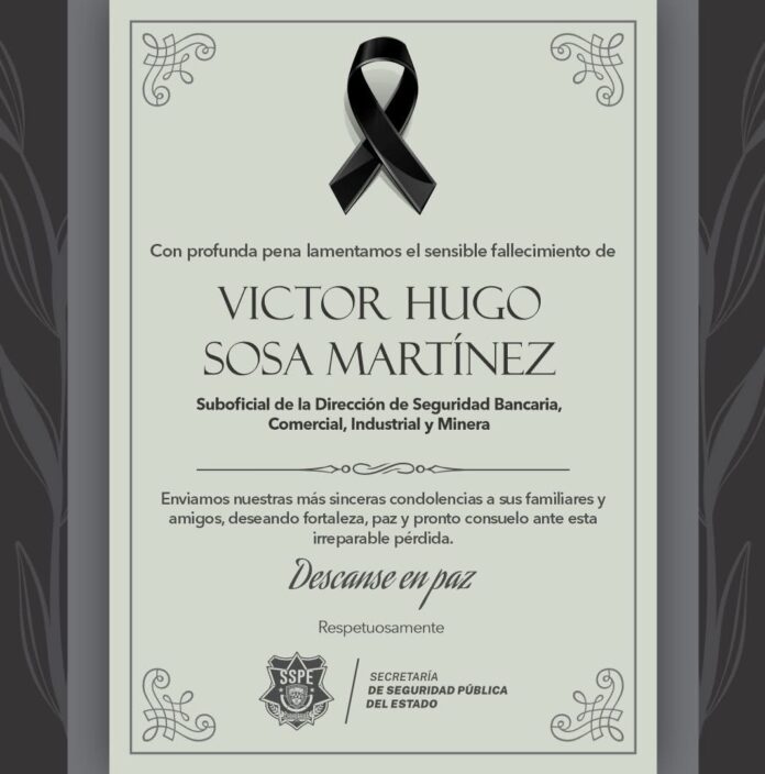 La Secretaría de Seguridad Pública Estatal (SSPE) expresó su pesar por el asesinato del suboficial Víctor Hugo Sosa Martínez, ocurrido la mañana de este lunes en la colonia Villas del Real.