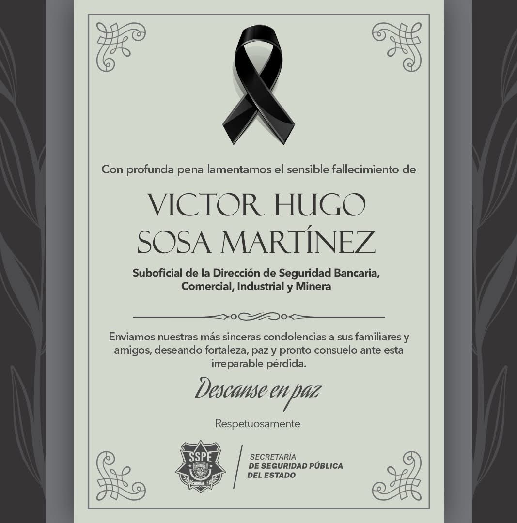 «Con profunda tristeza y consternación, la SSPE lamenta el fallecimiento del compañero y amigo, Víctor Hugo Sosa Martínez, elemento ejemplar de nuestra Policía del Estado, quien fue cobardemente atacado. En nombre de todos los que formamos parte de esta institución, expresamos nuestras más sinceras condolencias a su familia, amigos y seres queridos», publicó la dependencia.