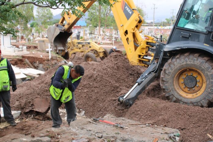 Además, una motoconformadora trabaja en la rehabilitación del cauce del arroyo que atraviesa el interior del panteón, mientras que seis cuadrillas adicionales realizan labores de limpieza, retirando escombros que pudieron haber quedado sobre las tumbas.
